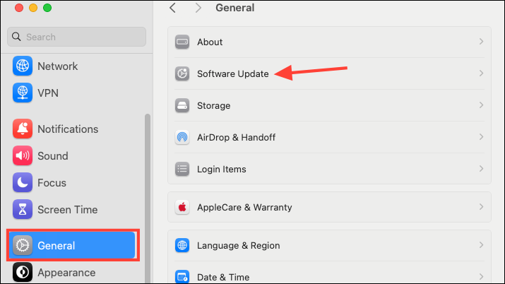 - Then, navigate to 'General' from the left menu and 'Software Update' from the right.