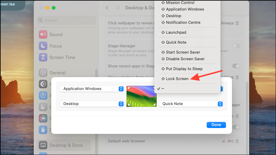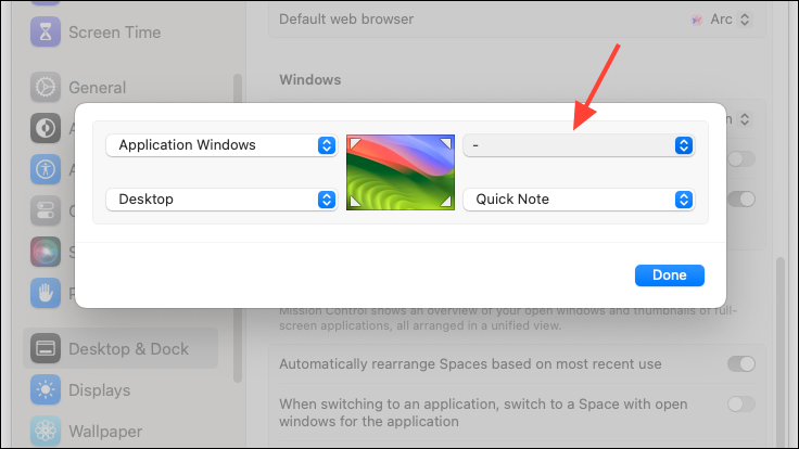 - Then, select the corner you want to configure and click on the drop-down menu to select an action.