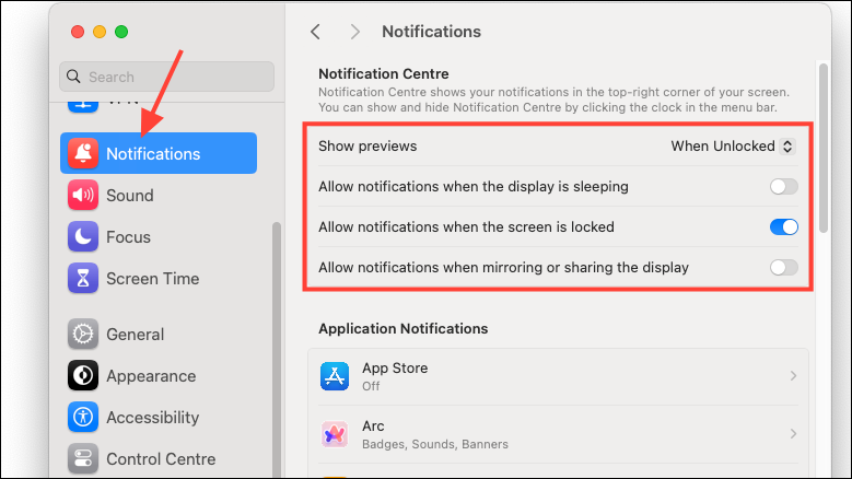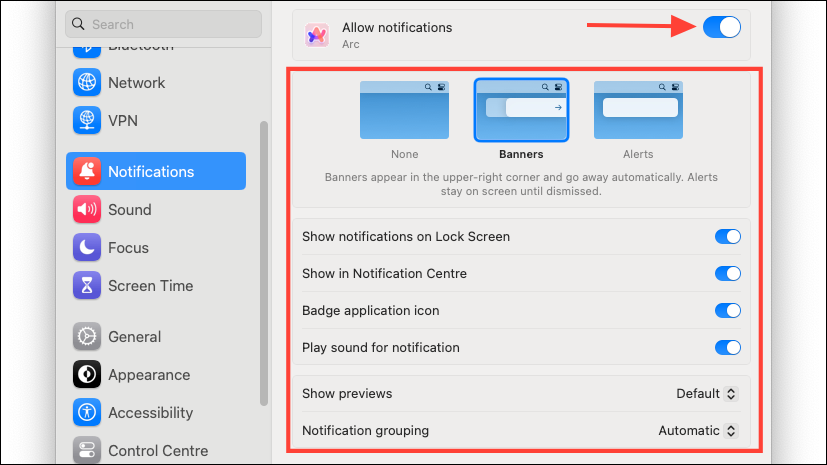 - You can manage overall notification settings, like when to see the previews, and when to receive the notifications, from the options at the top.