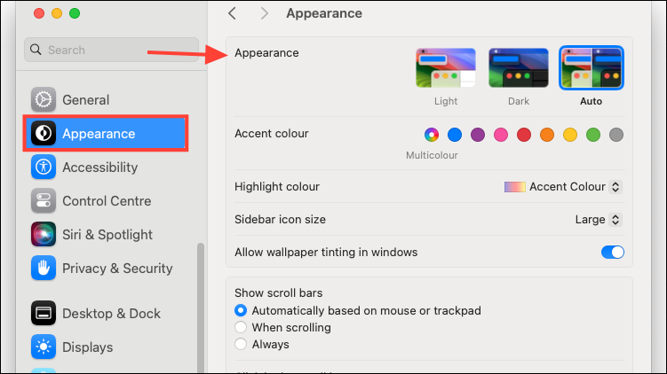- Here, you can customize the rest of the appearance, like using the light/ dark/ auto mode, accent colors, highlight colors, etc.