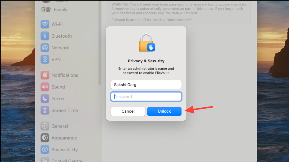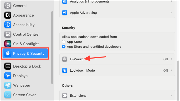 Settings>Privacy & Security. - Scroll down and click on the 'FileVault' option.