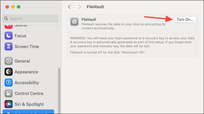 - Click on 'Turn On' to enable FileVault.