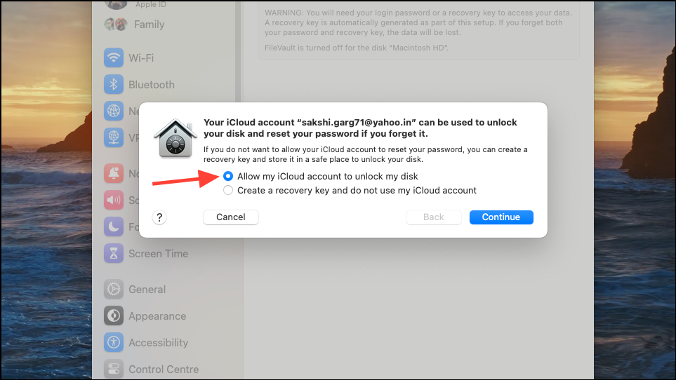 - Then, choose whether you want to use your iCloud account or create a Recovery key to unlock your disk in case you forget your Mac's password.