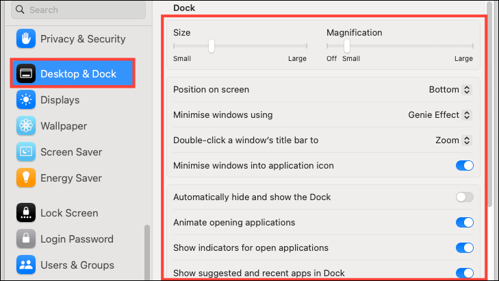 - Here, you can customize your Dock settings, like the position of the Dock, magnification effects, whether you want to use the Genie effect for minimizing apps or not, automatically showing/ hiding the dock, etc.