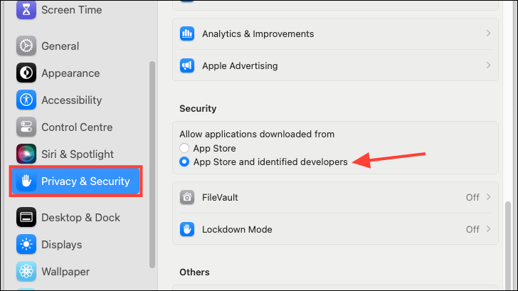 - Scroll down and select 'App Store and identified developers' under the 'Security' section, instead of simply 'App Store' which will be the default setting.