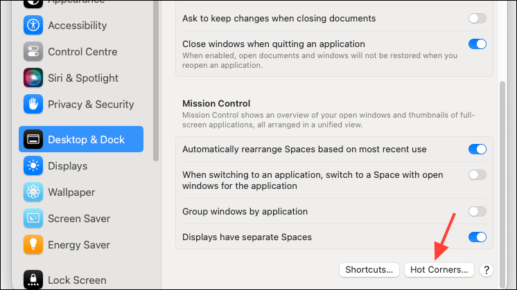 - Scroll down and click the 'Hot Corners' button.