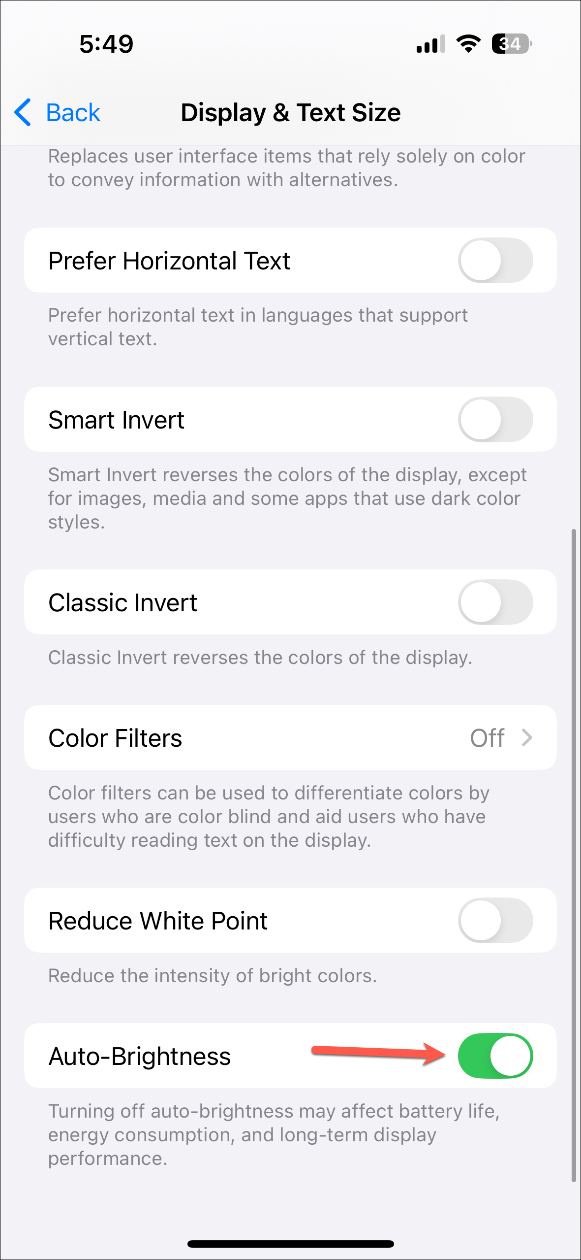 - Scroll down and turn on the toggle for 'Auto Brightness'.