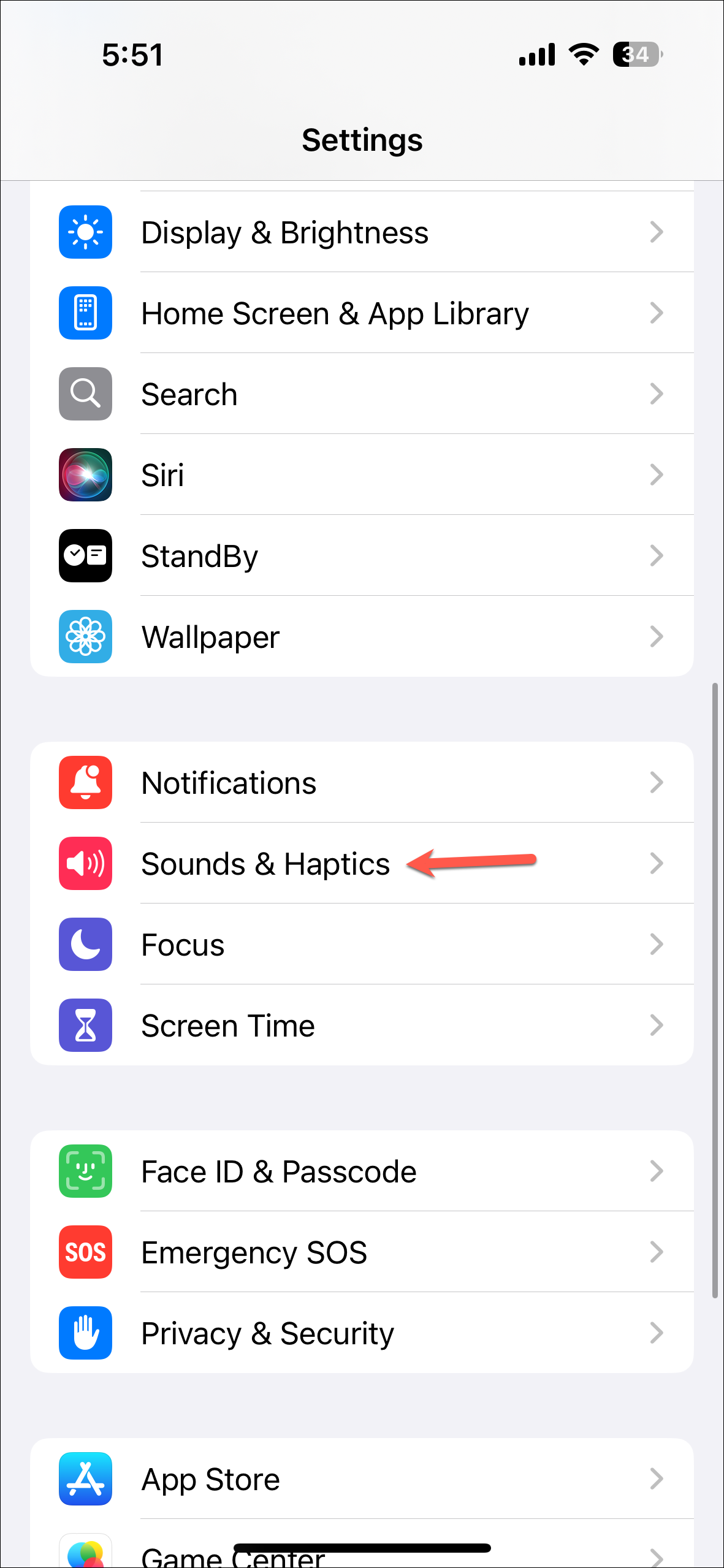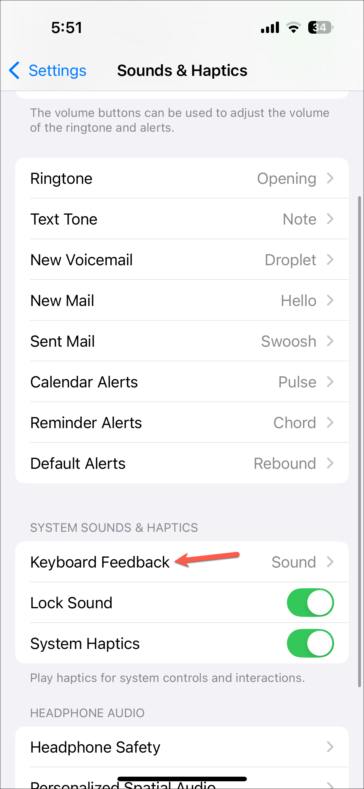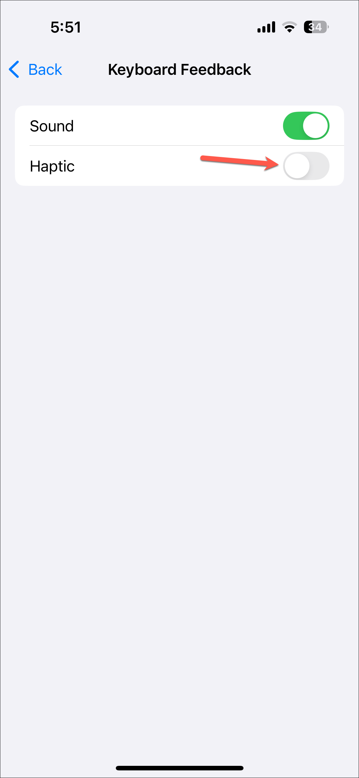 - Turn off the toggle for 'Haptics'.