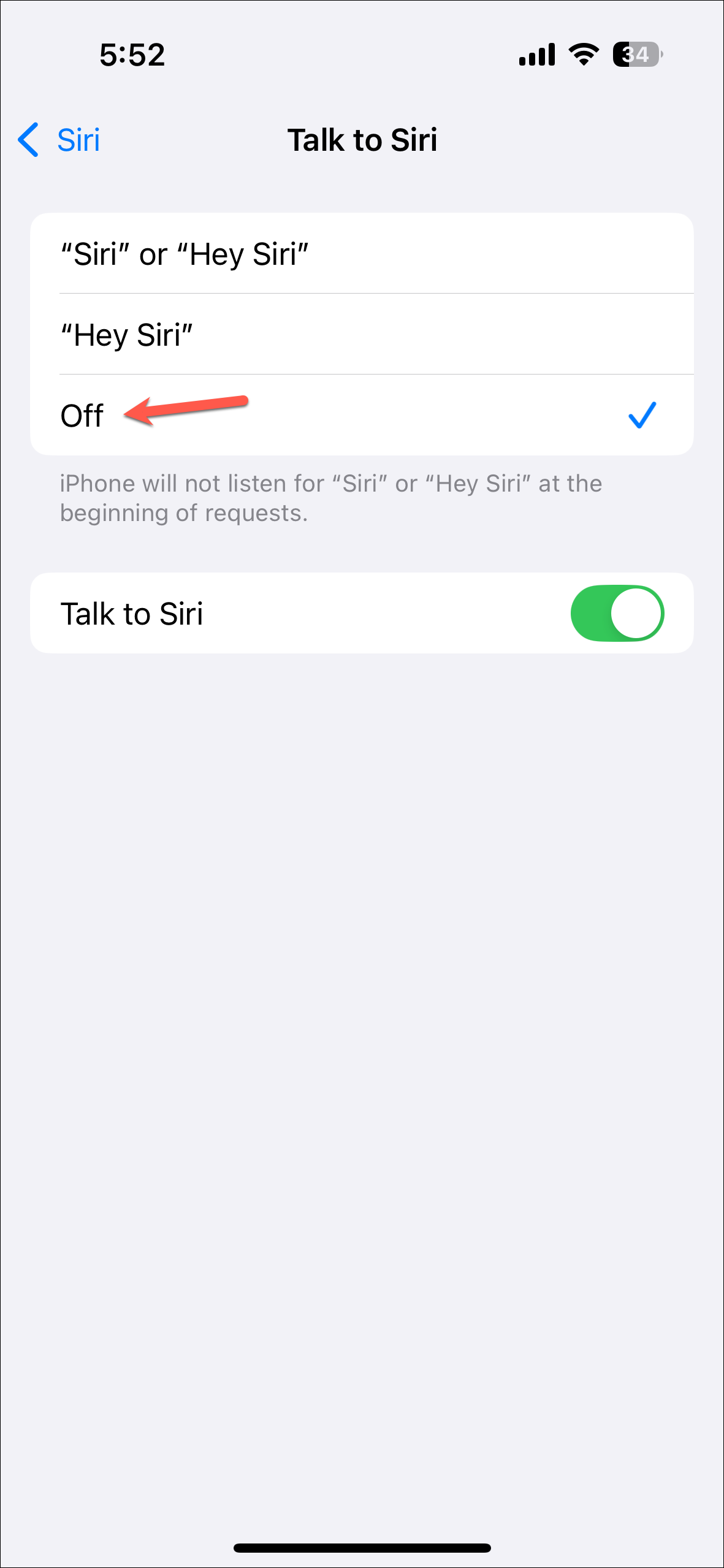 - "Hey, Siri" lets you use Siri hands-free; disabling this option would mean you cannot use Siri hands-free. But you can still talk to Siri by long-pressing the Lock button.