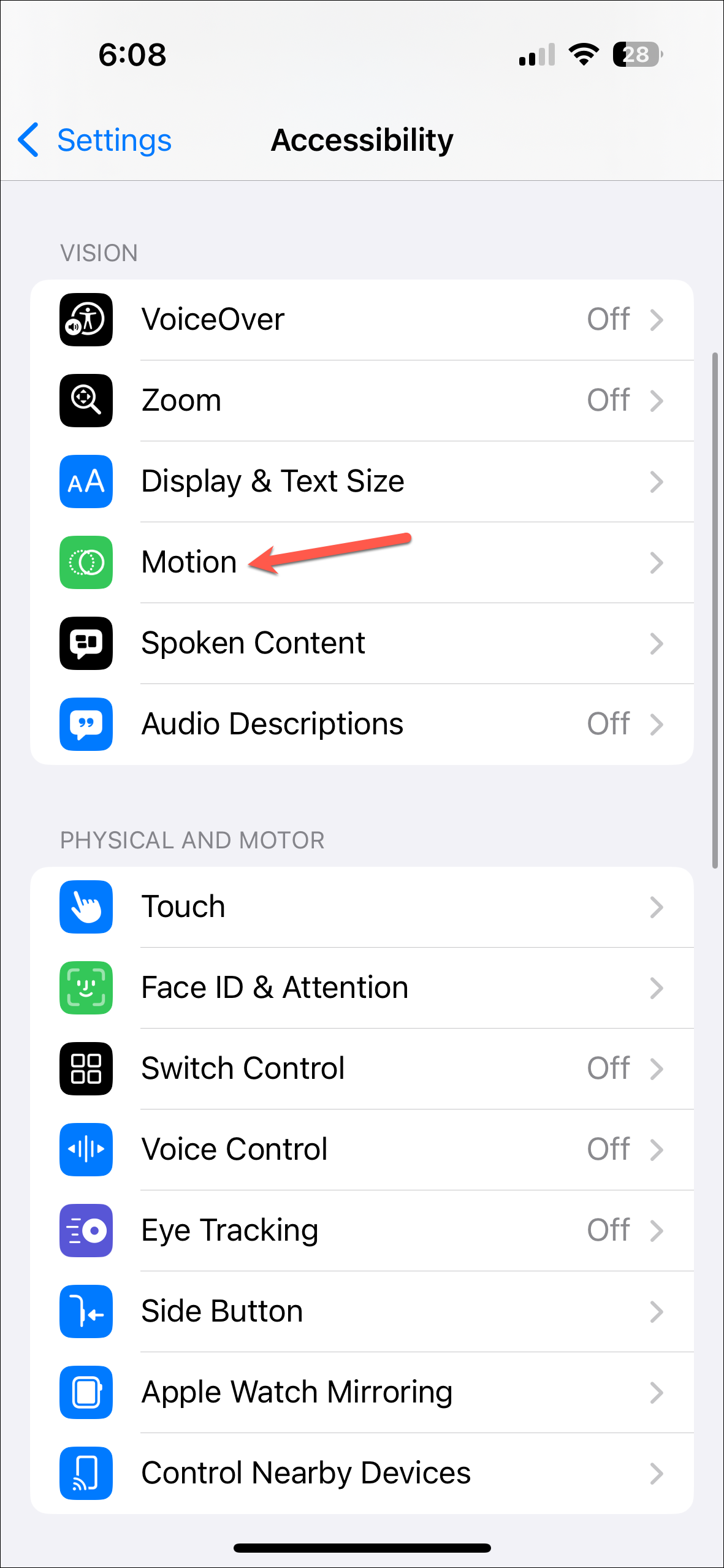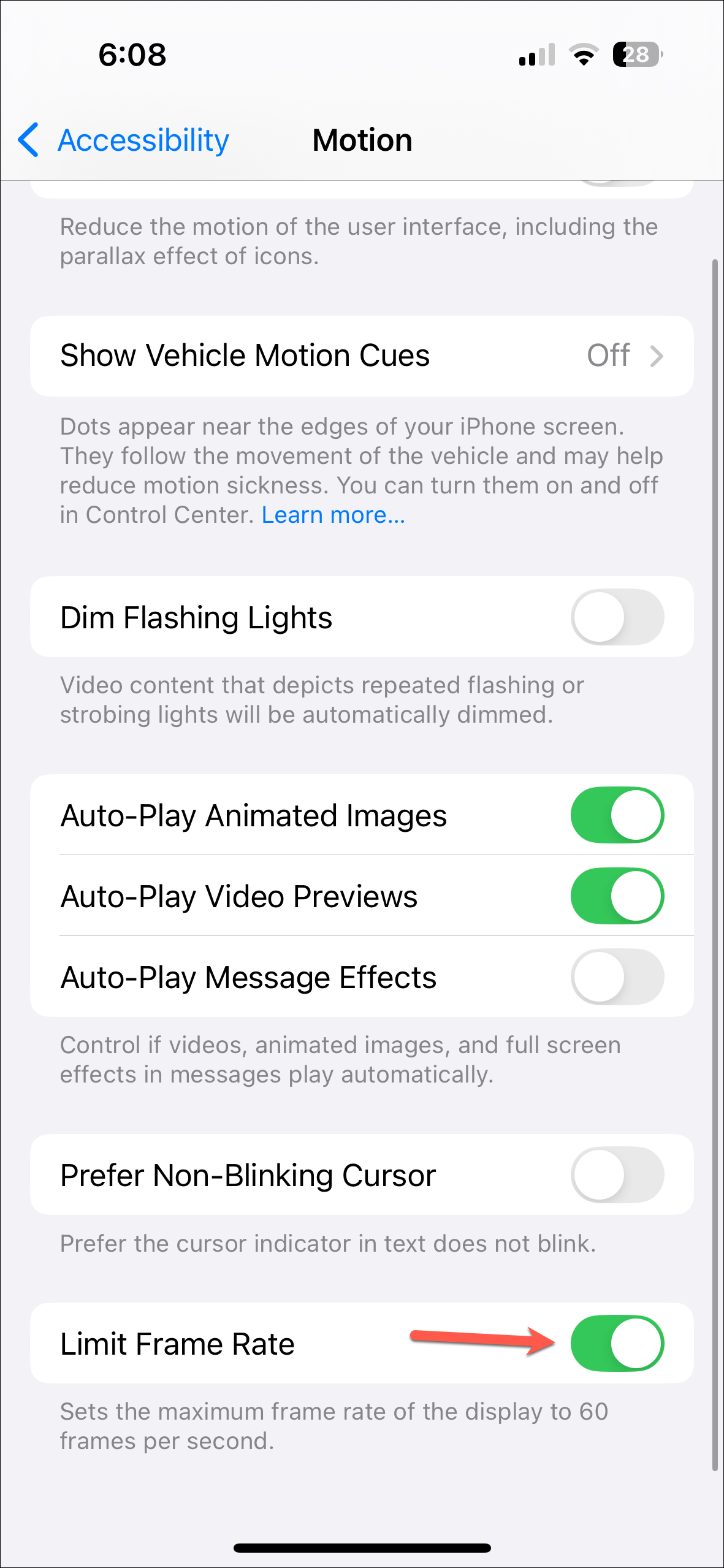 Settings>Accessibility>Motion. - Then, turn on the toggle for 'Limit Frame Rate'.