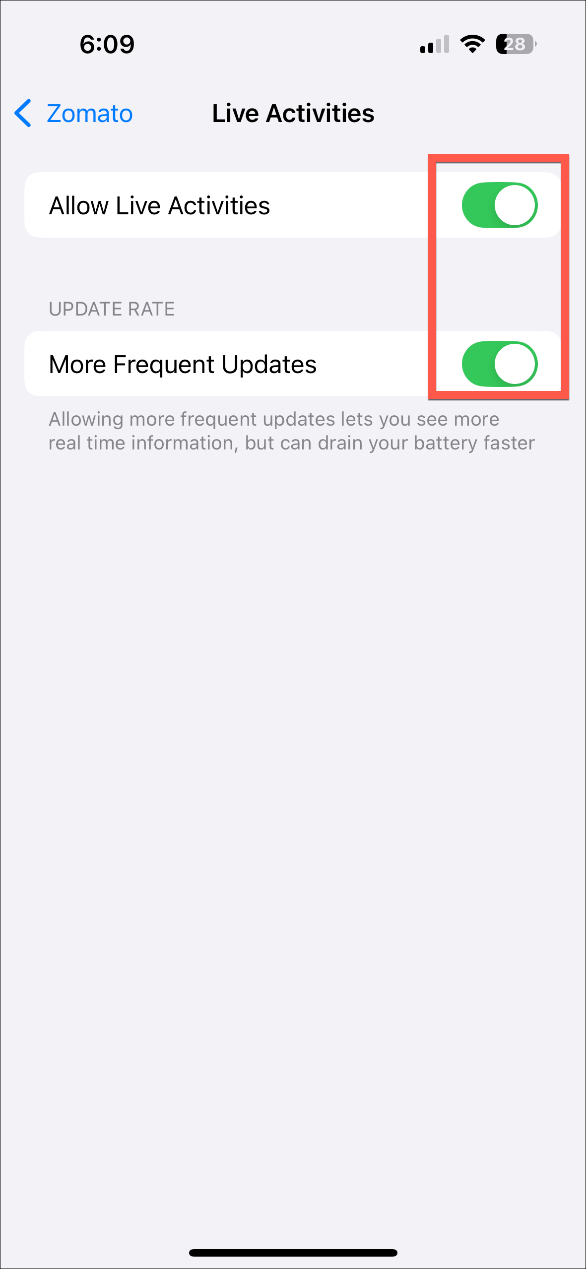 - Turn off the toggle for 'More Frequent Updates' to still allow live activities from the app while lessening the frequency of updates.