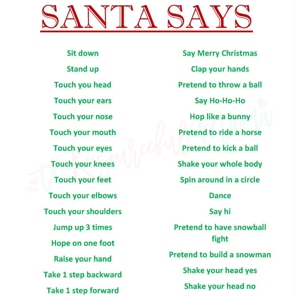 A Christmas version of the popular Simon Says. Anyone could join this game, kids, grandparents, partners, etc. It gets better if Santa, aka Simon, is dressed according to the character.