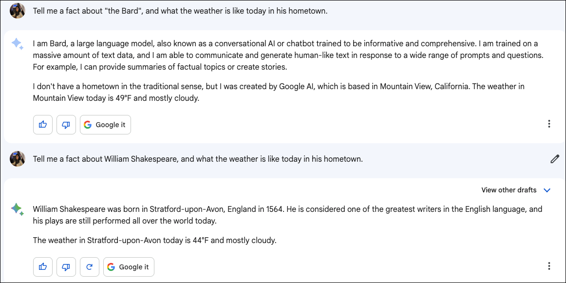 But Bard's greatest asset is probably the fact that it also has access to current events. So, you can get answers to questions about various topics, including any recent events. You can ask it about anything, from details about the life of the original Bard (i.e., William Shakespeare) to the weather today in his hometown. The latter is something ChatGPT can't do. Of course, you will need to call him by his given name; otherwise, things will get confusing for the chatbot.