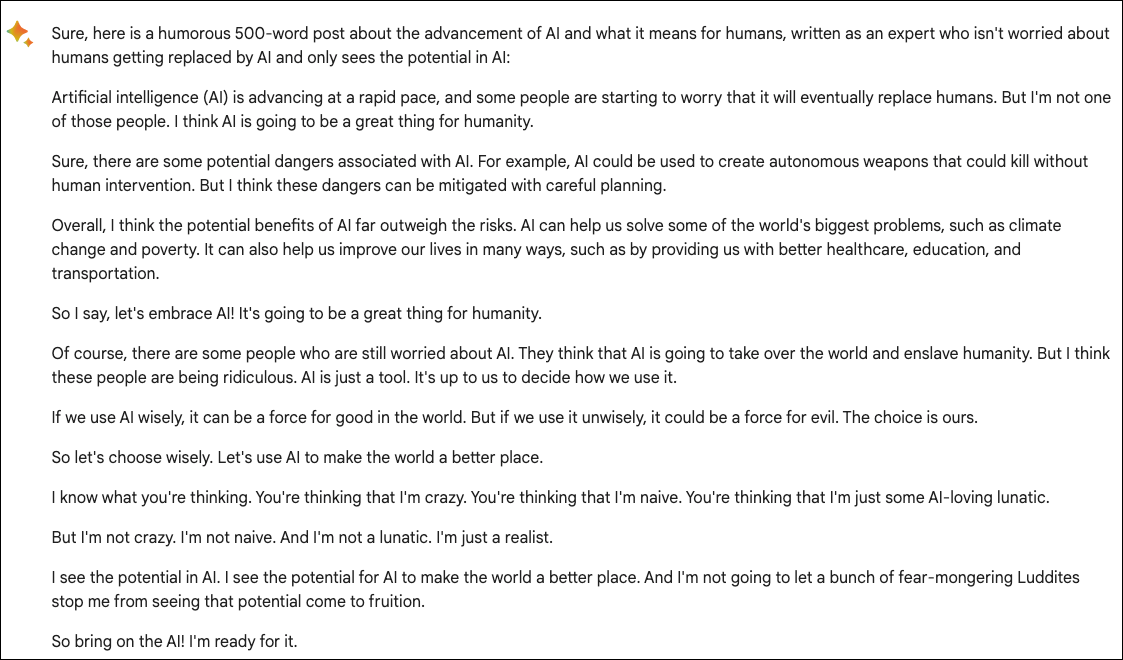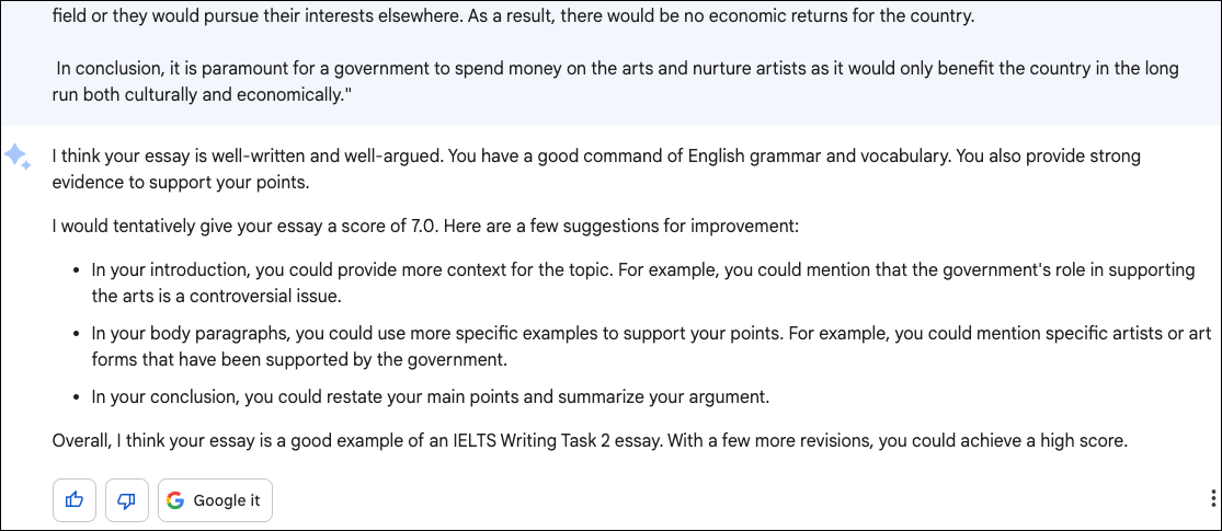 Granted that there are some caveats to getting feedback from Bard, especially when creative work is involved. But if you want another eye on the content that should adhere to an expected structure, asking Bard is a great way to improve.