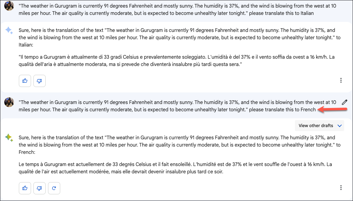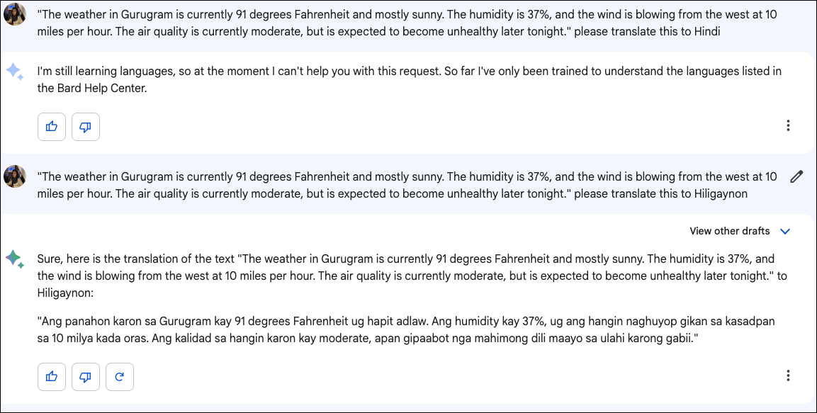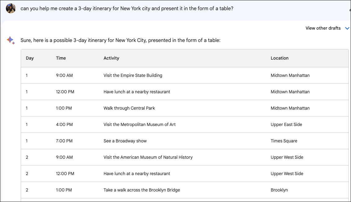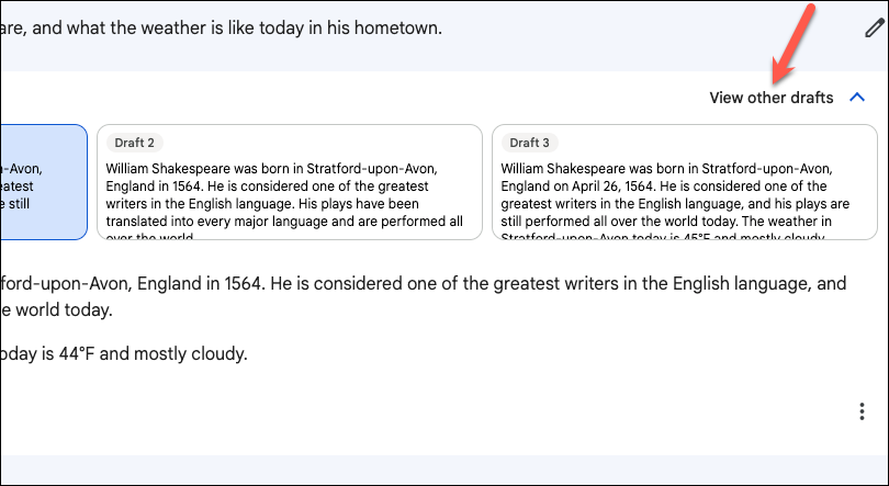 One of the unique features of Bard is that in addition to its original response, you can also view two other drafts for the same query. This can be particularly useful if you're taking the chatbot's help to write something; additional drafts mean additional ideas and content. The option to view other drafts is only available for the latest respond in the conversation.