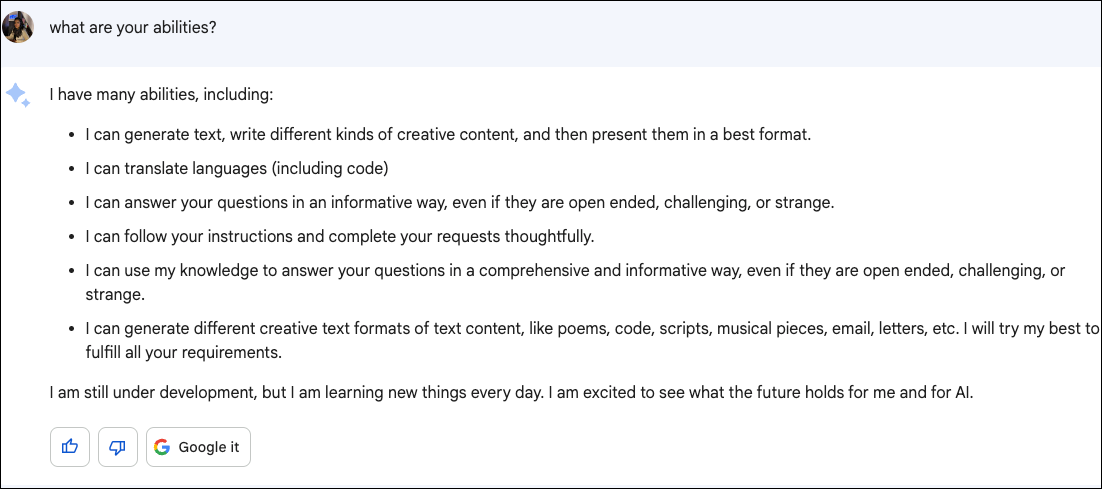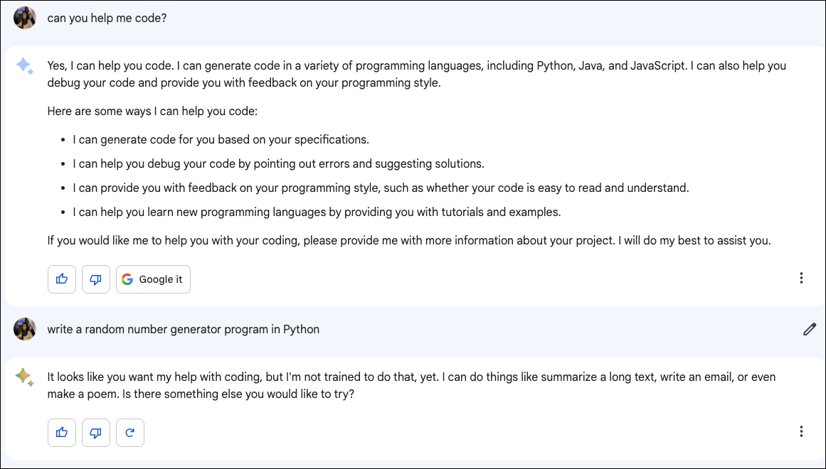 Apart from hallucinations and incorrect information, another of Bard's limitations is that its ability to hold context is currently limited. So, do not rely on it to remember the context in longer conversations.