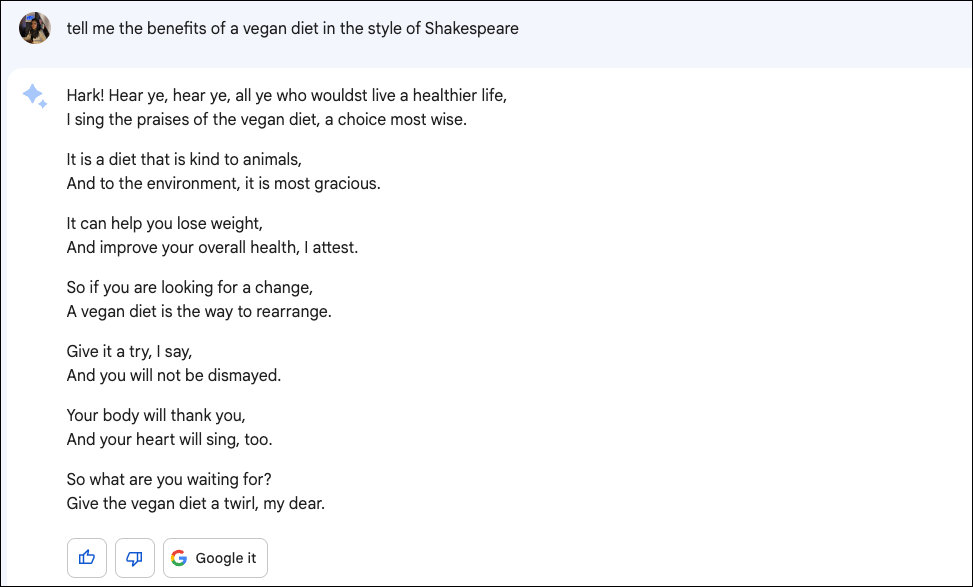 To spice things up, you can make Bard write in the style of your favorite author. So, Bard can give you the information in the style of the original Bard. Of course, it cannot bring the same level of ingenuity as William Shakespeare, but it definitely makes for a fun read.