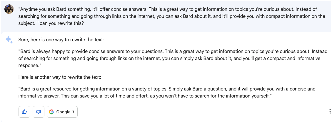 You might have already known that it can help you write, but did you know that Bard is also proficient at rewriting content? Just provide it with a paragraph and ask it to rewrite; it'll do a marvelous job. It might even throw in extra information related to the content you provided.