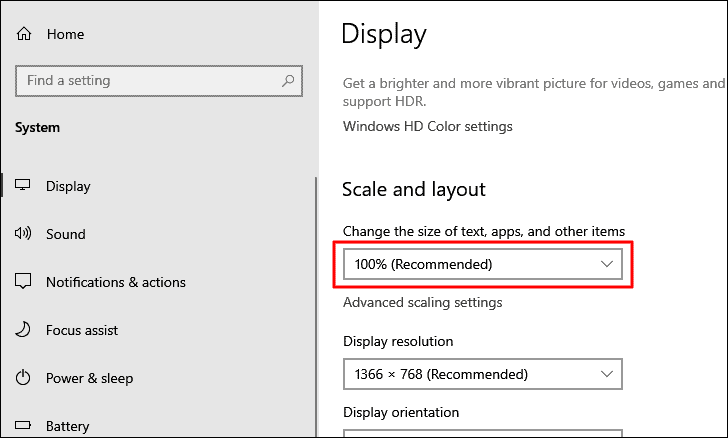 Under ‘System’ settings, the ‘Display’ tab will open by default. Locate the ‘Scale and layout’ heading and then set the ‘Change the size of text, apps, and other items’ to ‘100%’, which is the recommended setting.