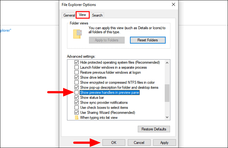 Next, navigate to the ‘View’ tab and then untick the option for ‘Show preview handlers in preview pane’. Finally, click on ‘OK’ at the bottom to apply the changes and close the window.