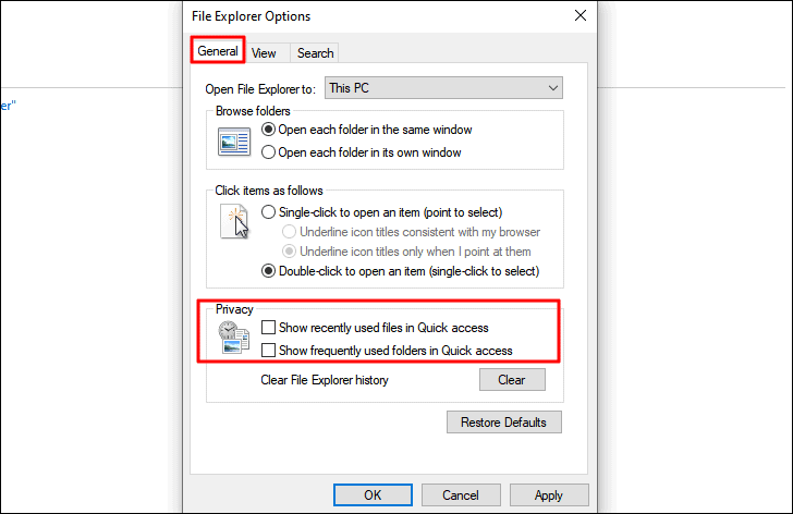 Next, under the ‘Privacy section and untick the checkboxes for’ Show recently used files in Quick access’ and ‘Show frequently used folders in Quick access’.