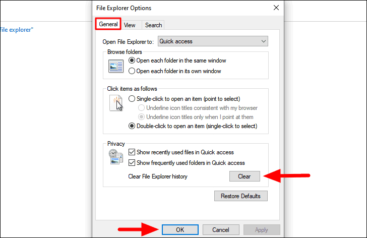 To clear the ‘File Explorer’ history, launch the ‘File Explorer Options’ window as discussed in the previous fix, and then click on ‘Clear’ under the ‘Privacy’ section in the ‘General’ tab. After you have cleared the history, click on ‘OK’ at the bottom to save the changes and close the window.