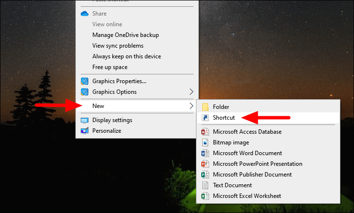Next, right-click anywhere on the desktop, hover the cursor over ‘New’, and then select ‘Shortcut’ from the menu.