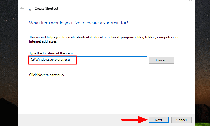 The ‘Create Shortcut’ window will now launch. Enter the following address in the box under ‘Type the location of this item’, and then click on ‘Next’ at the bottom.
