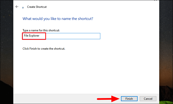 You will now be asked to enter a name for the shortcut, type ‘File Explorer’, and then click on ‘Finish’ at the bottom to create the shortcut.