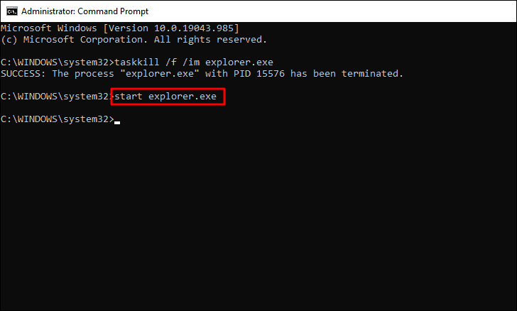 Many tech-savvy users prefer using ‘Command Prompt’ for various functions, hence, it’s necessary to include this method of restarting ‘File Explorer’ as well.