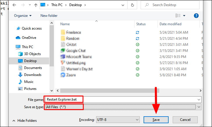 Navigate to the desktop in the ‘Save as’ window and enter the file name as ‘Restart Explorer.bat’. Ensure that you have selected ‘All Files’ for the ‘Save as type’ option. Finally, click on ‘Save’ at the bottom to save the file