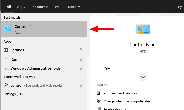 To modify ‘File Explorer’ settings, search for ‘Control Panel’ in the ‘Start Menu’ and then click on the search result to launch the app.