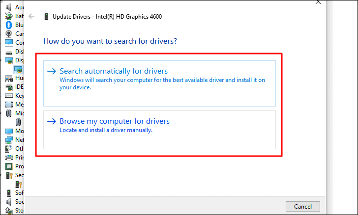 The ‘Update Drivers’ window will now launch. You now have two options to update the driver, either let Windows search your computer for the best one or install it manually. It’s recommended that you let Windows search for and install the driver since the risk is very low in this case.