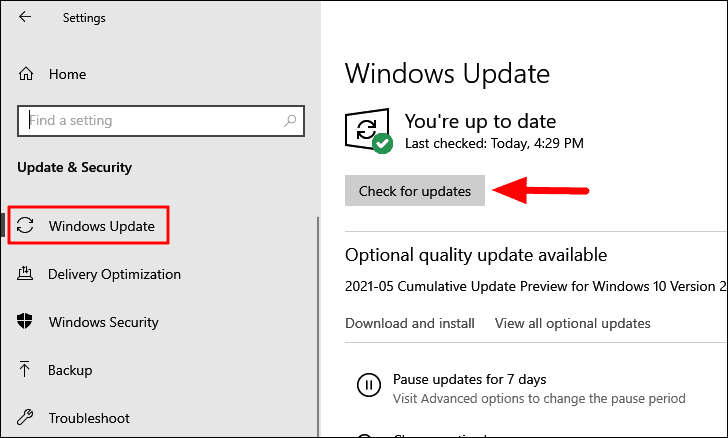 In the ‘Update & Security’ settings, the ‘Windows Update’ tab will open by default. Next, click on the ‘Check for updates’ option on the right.