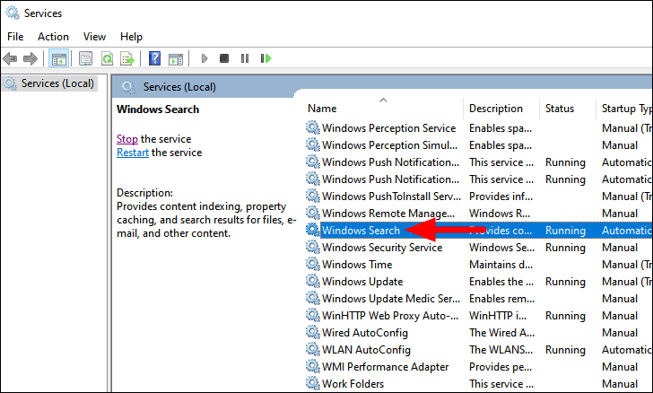 In the ‘Services’ window, locate the ‘Windows Search’ service. The services are listed in alphabetical order, so you can scroll down and easily locate it. After you have found the service, double click on it to launch the properties.