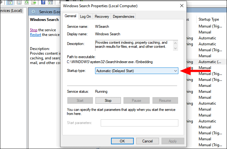 In the properties Window, click on the box next to ‘Startup type’ to view the other startup options.