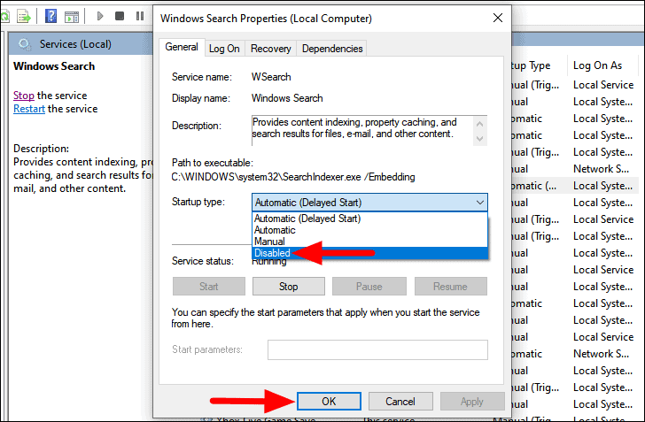 8. Disable the Windows Search Service