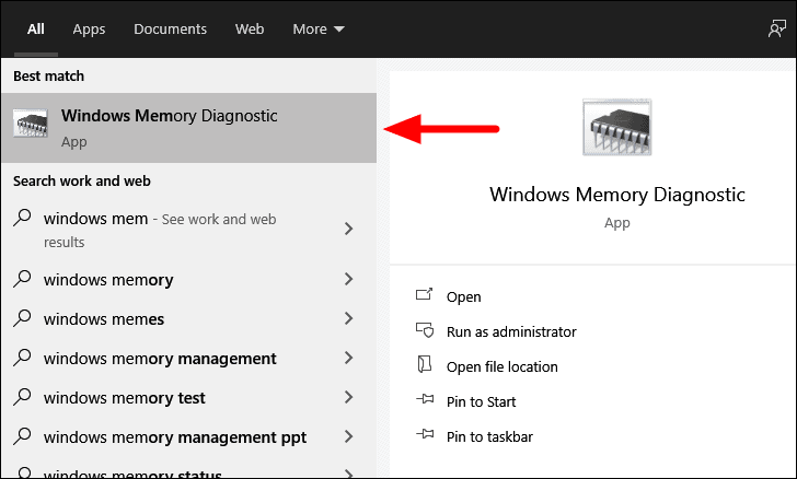 To fix the memory issues, search for ‘Windows Memory Diagnostic’ in the ‘Start Menu’ and then click on the search result to launch the app.