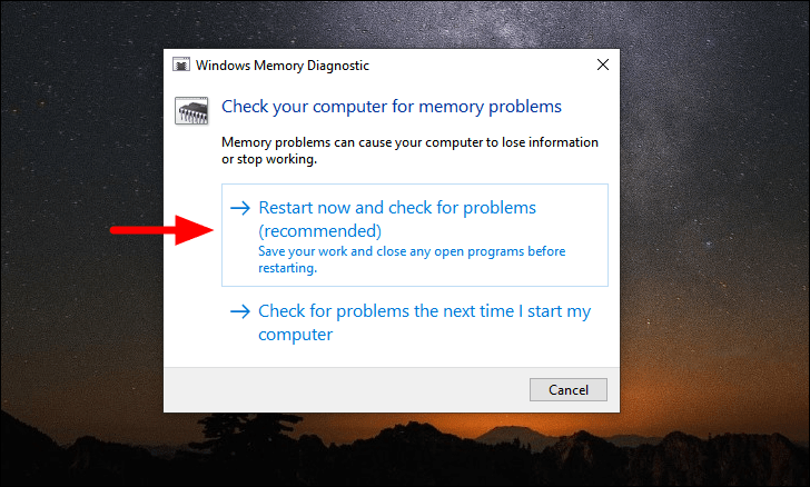 In the ‘Windows Memory Diagnostic’ screen, you will find two options, either to restart the computer right away and check for problems and do it the next time you restart. It’s recommended that you run it right away by selecting the first option. Also, save any files that you working on to avoid loss of data since the computer will restart.