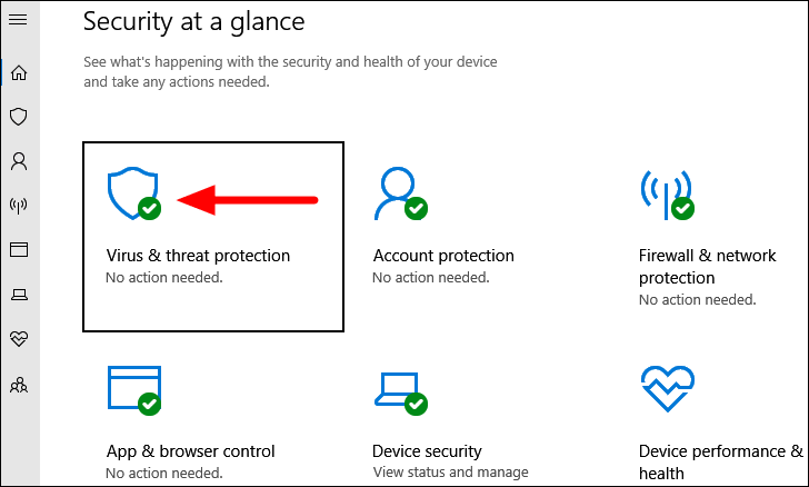 In the ‘Windows Security’ app, you will find various options. Click on ‘Virus and threat protection’ to proceed.