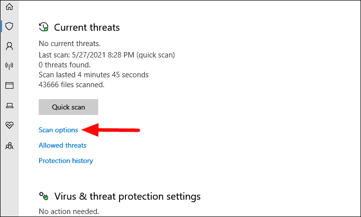 Next, click on ‘Scan options’ to view the other options that you since you will only find ‘Quick scan’ listed here.