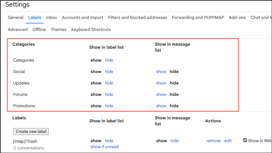- On the Settings page, click on the 'Labels' tab and scroll down to the 'Categories' section.