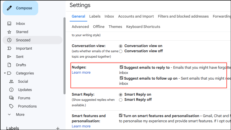 - To enable Nudges, go into Gmail settings and scroll down while in the 'General' tab until you reach the 'Nudges' section.