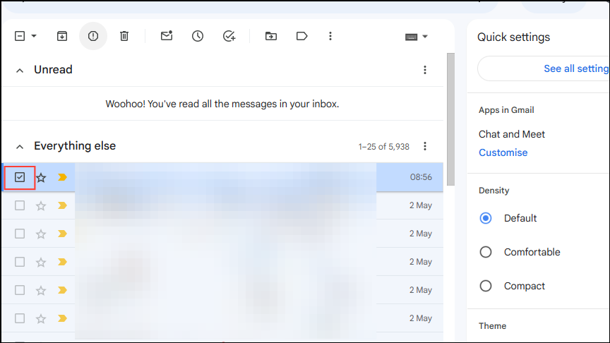 - Click on the check box next to the email you want to mark as spam to select the message.
