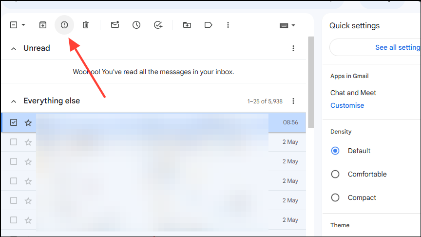 - This will show you a few buttons at the top. Click on the button that appears as an exclamation mark within a circle to mark the email as spam.