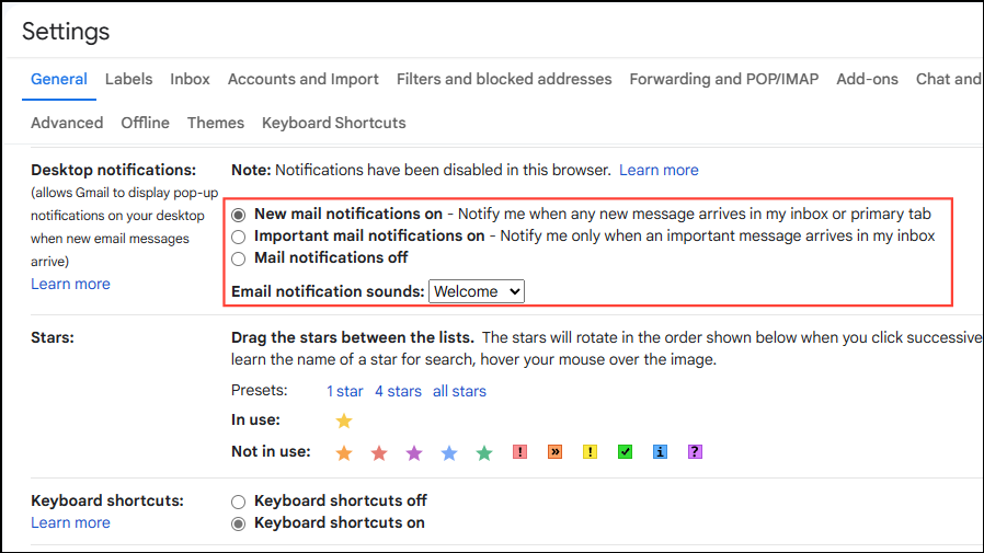 - To enable desktop notifications, open the Gmail settings page and scroll down to the 'Desktop Notifications' option on the 'General' tab.