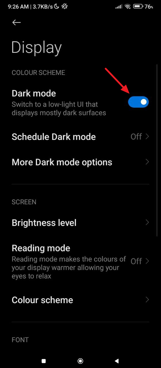 - Then tap on the 'Dark Mode' toggle to turn it on.