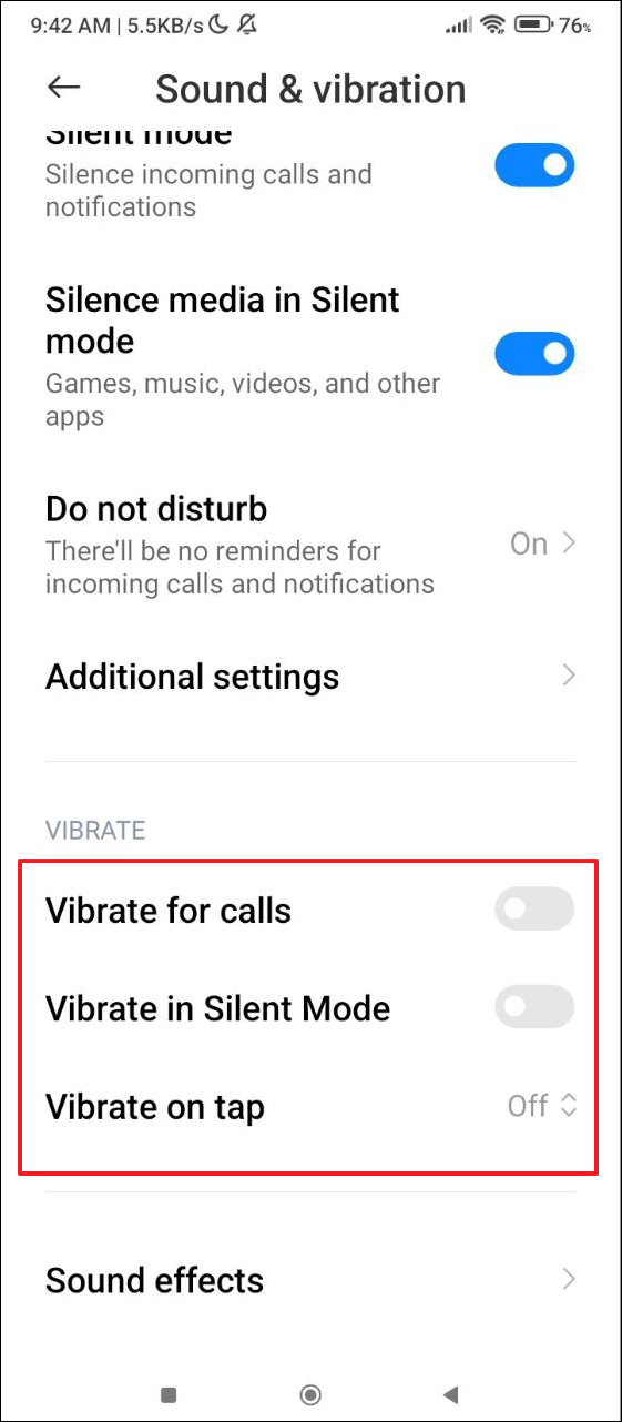 - Look for the various 'Vibration' options, such as 'Vibrate for calls', and tap on their respective toggles to disable them.