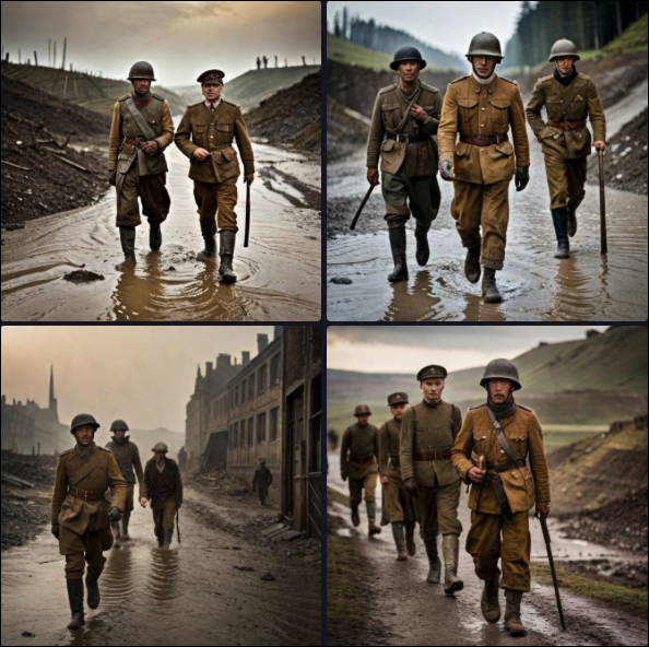 - A photorealistic portrayal of life on the Western Front during World War I. The scene captures the harsh reality of war as soldiers navigate the trenches amidst the muddy and grimy conditions. The soldiers wear tattered uniforms and carry their weapons, reflecting the weariness and determination etched on their faces. The landscape is scarred by the ravages of war, with barbed wire fences and shell craters scattered throughout. The camera lens used is a telephoto lens, capturing the poignant moments of camaraderie and the toll of battle etched on the soldiers' expressions. The lighting is natural and somber, echoing the somber atmosphere of the frontlines. The high-resolution image immerses viewers in the gritty reality of life on the Western Front, offering a glimpse into the bravery and sacrifice of those who endured the hardships of war.