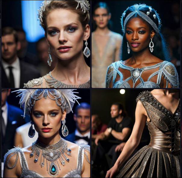 - Stunning close-up shot of a model on a catwalk wearing an intricately detailed sparkling dress